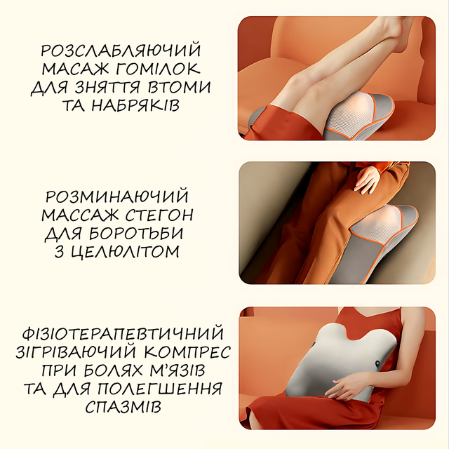- Ергономічний дизайн: Масажер зручно розташовується на тілі, забезпечуючи ефективний масаж попереку та шиї з підтримкою природних вигинів;