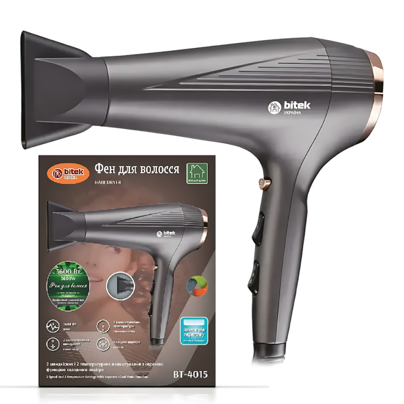 Фен для волосся BITEK BT-4015 — 3600 Вт, 2 швидкості, 3 режими, Cool Shot, антистатик, 1.8 м кабель
