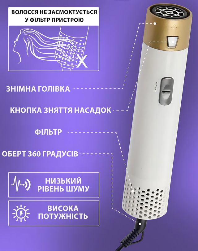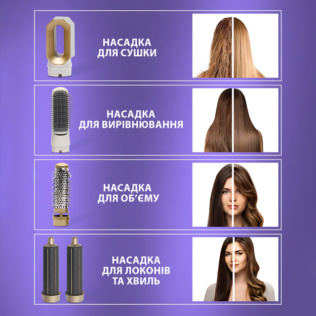 ???? Забудьте про нудні зачіски та нескінченний годинник біля дзеркала! З багатофункціональним стайлером 5 в 1 Hot Air Styler ви за дві секунди створите об'єм, локони, ідеально гладкі пасма або грайливу челку. Хочете бути богинею щодня — вранці на роботу, ввечері на побачення? Цей стайлер створений саме для вас!