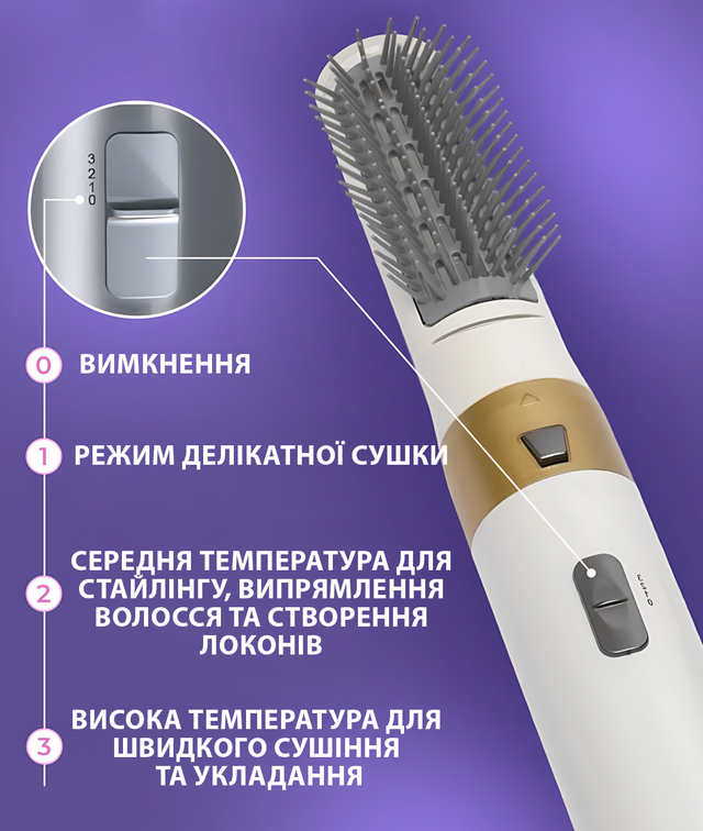 - ???? Розумний вибір температур — 3 температурні режими дають змогу підібрати ідеальний потік для тонкого, густого або примхливого волосся.