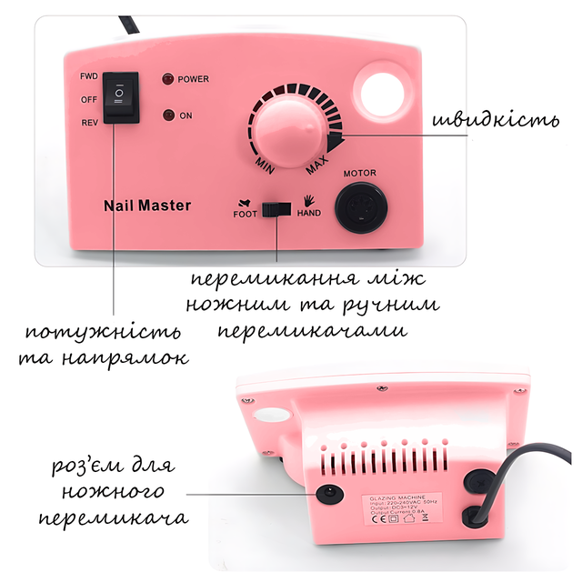 Фрезер для манікюру та педикюру Nail Master ZS-602, 65 Вт, 45 000 об./хв, реверс, педаль, набір фрез, рожевий