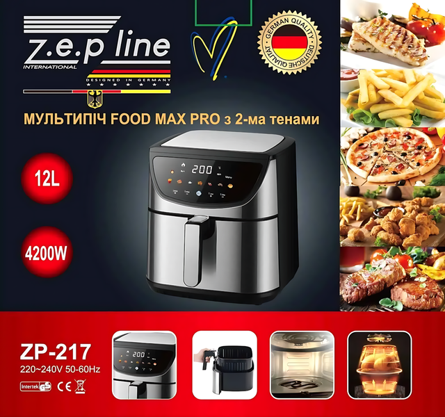 Zepline ZP-217 — більше, ніж просто фритюрниця. Це кухонний комбайн для смаження, здатний швидко та якісно приготувати страви для сім'ї, гостей. Або цілого потоку клієнтів. Обладнана двома незалежними ТЕНами загальною потужністю 4200 Вт. Містка чаша на 12 літрів і сенсорним керуванням! Вона легко справляється з завданнями будь-якої складності — від картоплі фрі до соковитих крилець.