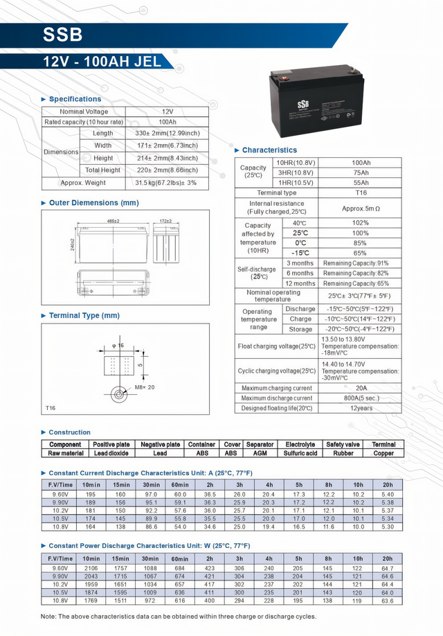 Гелевий акумулятор SSB 12 V 100 Ah GEL призначений для використання в системах безперебійного живлення. Особливість цього акумулятора полягає в тому, що його електроліт наведений у желеподібний стан завдяки додаванню сполук кремнію. Така структура забезпечує високу надійність і безпеку експлуатації.