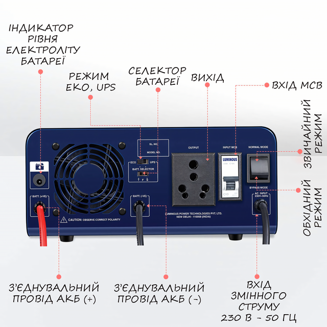 Luminous Zelio-900W — це резервне джерело безперебійного живлення (ІБП), яке забезпечує надійне резервне живлення для домашніх, промислових, проєктних і бізнес-пристроїв у разі вимкнення електроенергії. Система генерує чисті синусоїдальні хвилі, аналогічні тим, що надходять із міської енергосистеми, що гарантує безпеку ваших приладів.