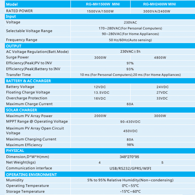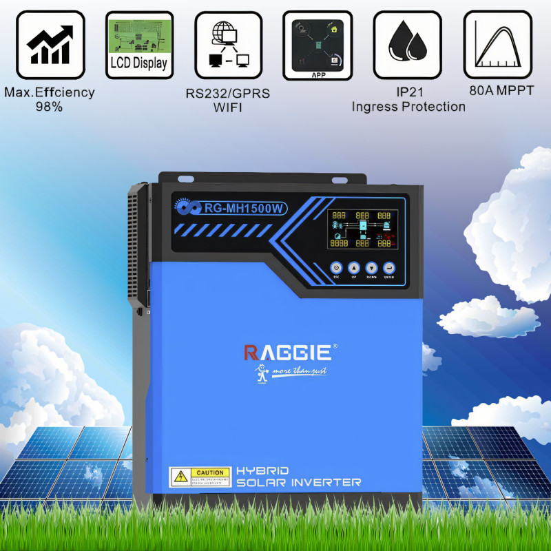 Гібридний інвертор Raggie RG-MH1500W 12 V MPPT-80A — це багатофункціональний пристрій, що поєднує в собі функції інвертора, сонячного контролера MPPT і зарядного пристрою, забезпечуючи безперебійне живлення в компактному портативному розмірі. Його основна особливість полягає в тому, що, крім звичайної функції автономного інвертора (з конфігурацією батареї), він також може повністю обходитися без батареї, використовуючи тільки сонячну енергію й мережу для спільної роботи.