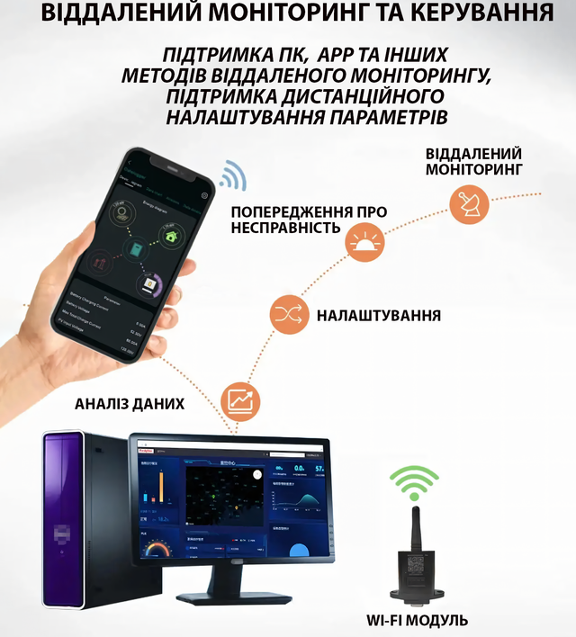 - Інтерфейси під'єднання: Підтримка USB, RS232, GPRS і Wi-Fi для віддаленого моніторингу та керування через iOS і Android пристрою, що дає змогу легко контролювати й керувати системою;