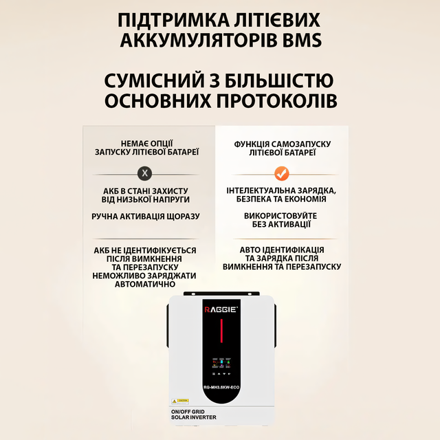 Підтримка різних типів батарей: Інвертор сумісний з різними типами батарей, включно з літієвими, що дає змогу вибрати найбільш відповідний варіант для конкретних умов експлуатації.