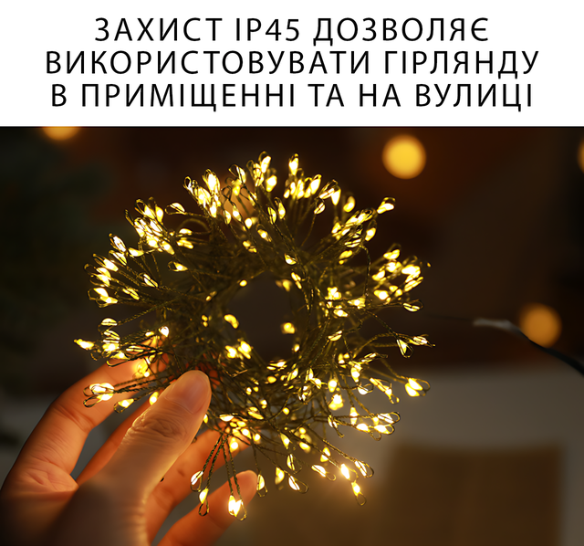 - Довжина 20 метрів: досить, щоб прикрасити ялинку, терасу або зробити стильні світлові композиції;