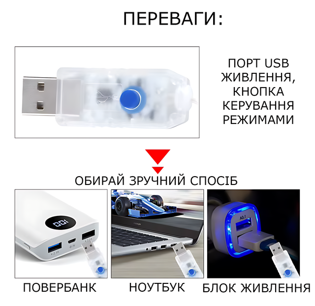Працює гірлянда від USB (5 В) — під'єднуй до адаптера, ноутбука, power bank або блоку живлення. Гнучкий дріт легко приймає будь-яку форму: обвивай ялиць, формуй напис, декоруй вазу, фотозону, полицю, підсвічуй композиції.