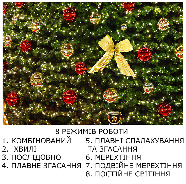 У гірлянди є 8 режимів світіння — від м'якого мерехтіння до динамічних переливів. Це ідеальний варіант для святкового столу, кімнати, офісу, фотосесій і затишного новорічного декору.