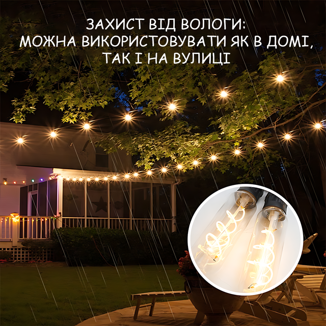 Гірлянда ідеально підходить для зовнішнього декору — фасадів будинків, дерев, терас, веранд, кафе та вітрин.