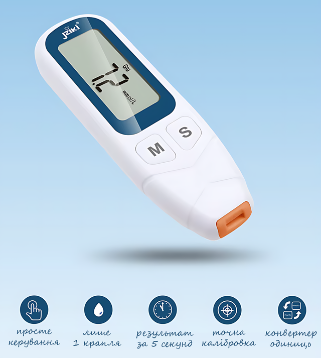 Глюкометр Jziki JZK-206 для вимірювання цукру в крові (висока точність, швидкий тест 5 сек, з акумулятором, ISO сертифікація)