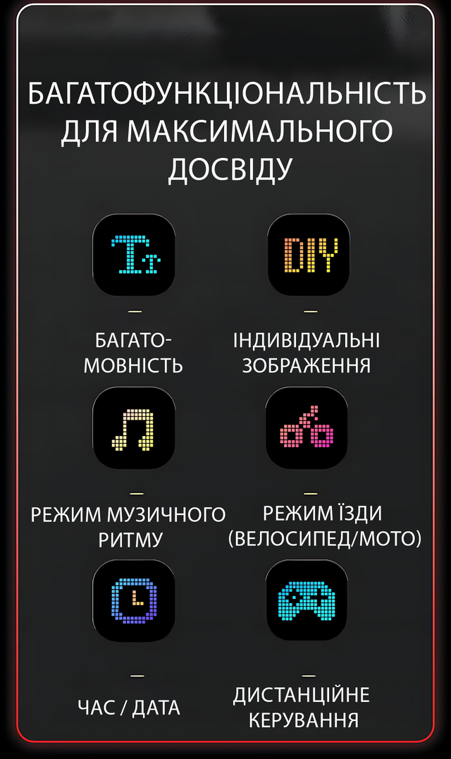 - ???? Музичний режим і режим "велосипед" — ідеально для шоу та декору