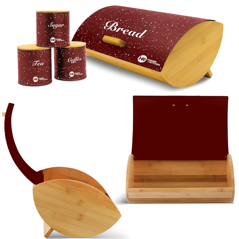 Хлібниця з бамбука та металу Higher Zepline ZP-042 + 3 баночки для сипких продуктів, червоний