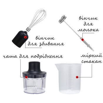Заглибний блендер Hoffmans HM-8043 5в1, 800 Вт, подрібнювач 1.5 л, віночок, насадки, чорний, неіржав..
