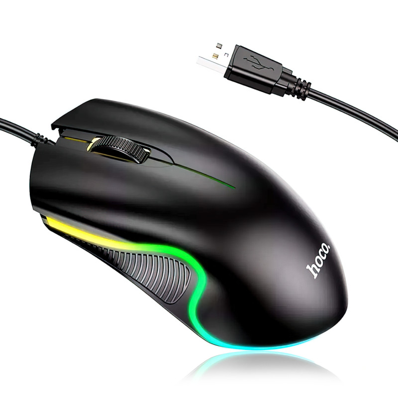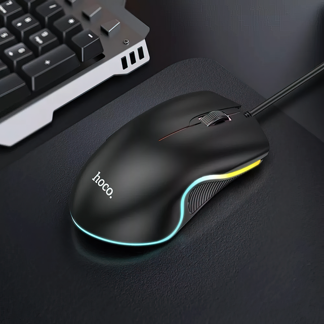 - Геймерський дизайн з RGB-підсвіткою: миша Hoco GM19 виділяється стильним геймерським дизайном і багатобарвною RGB-підсвіткою, що додає атмосферності;