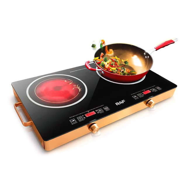 Електроплита RAF R.8088 має 2 конфорки по 2400 Вт і склокерамічну поверхню з ручками. Для використання рекомендується посуд із плоским дном діаметром від 12 до 26 см, як-от сталевий, чавунний, емальований, неіржавкий, керамічний, мідний або алюмінієвий. Ця настільна плита легка та компактна, ідеальна для маленьких кухонь, дач і будинків загородком. Модель обладнана склокерамічною поверхнею, яка швидко нагрівається завдяки своїй чудовій теплопровідності. У побутових версіях температурна межа становить зазвичай 300 °C.