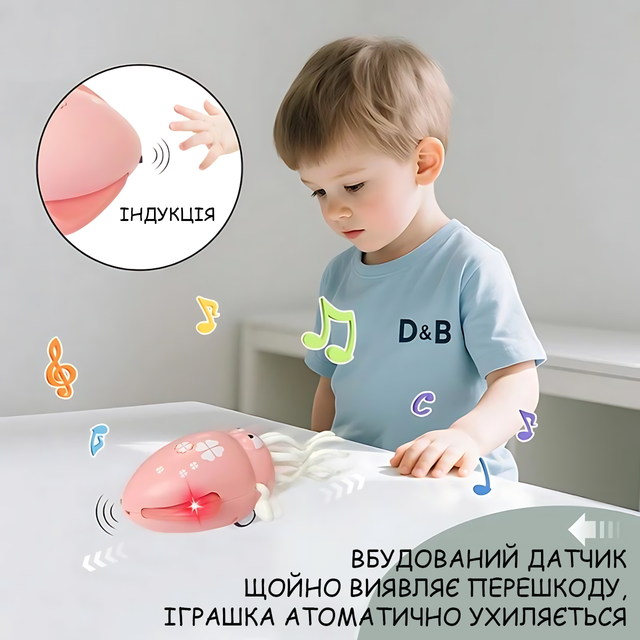 Завдяки розумному сенсору об'єктів, восьминіг вчасно змінює напрямок. І легко уникає зіткнень зі стінами. Або меблями. Його плавні рухи + світлові ефекти створюють справжнє мінішоу в дитини вдома.