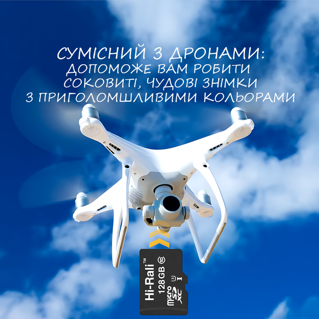 Картка пам'яті Hi-Rali MicroSDXC на 128 GB з адаптером, що підтримує інтерфейс UHS-3 та клас швидкості 10. Підходить для збільшення обсягу пам'яті професійних камер та інших пристроїв, забезпечуючи високу продуктивність, особливо для відео високої роздільної здатності.