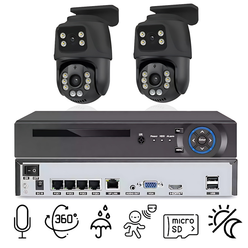 Комплект відеоспостереження з двома камерами та реєстратором містить IP Wi-Fi камери з двома об'єктивами та функцією віддаленого доступу через застосунок v380Pro. Камери обладнані роздільною здатністю 8 Мп (4Мп + 4 Мп), забезпечують нічне бачення та підтримують двосторонній аудіоканал. Вуличне встановлення камер з інфрачервоною підсвіткою до 25 м гарантує цілодобове спостереження.