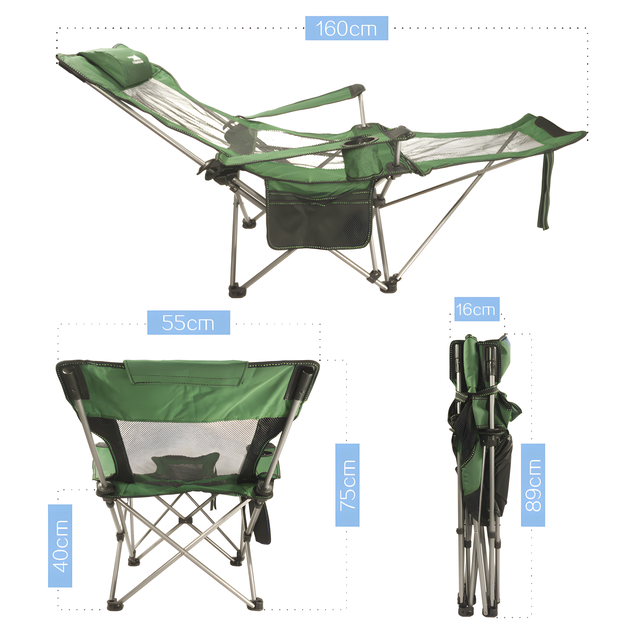 Обладнане широкими підлокітниками, підставкою для склянки та зручним підголівником, це крісло пропонує підвищений рівень комфорту. Неважливо, де ви перебуваєте — у саду або на березі річки — ці меблі легко складаються й розкладається, займаючи мінімум місця під час транспортування.