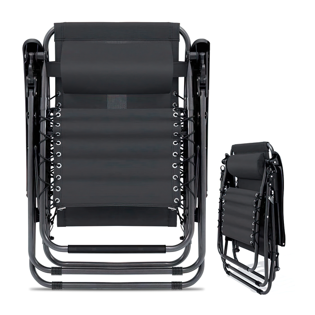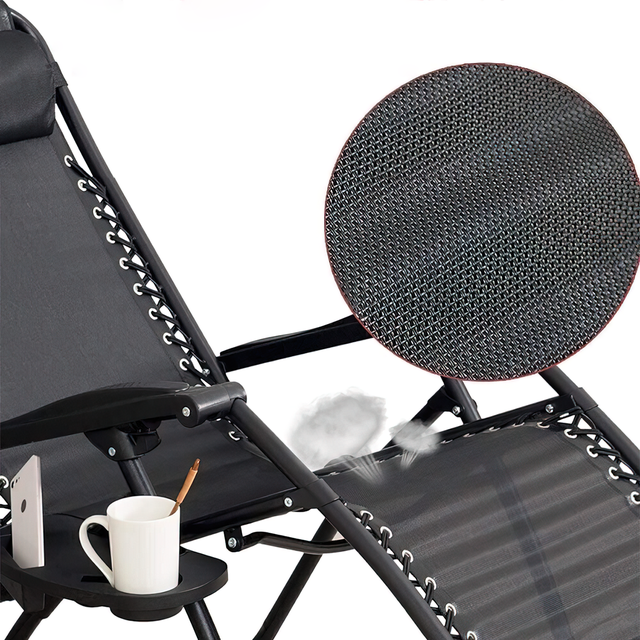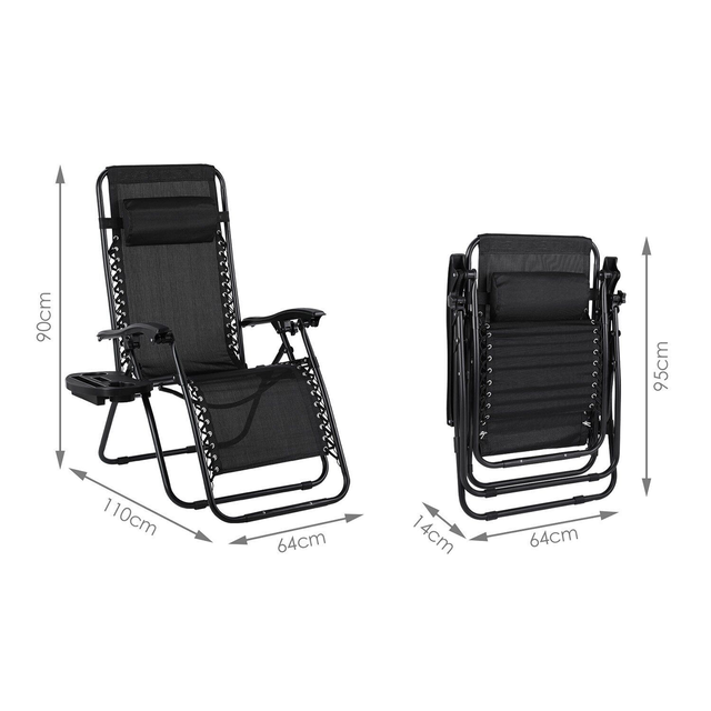 Шезлонг має міцну та надійну конструкцію, яка витримує навантаження до 120 кг і зручна навіть для високих людей. Каркас шезлонга виготовлений зі сталевих труб із чорним епоксидним покриттям, яке запобігає появі іржі та подряпин. Сидіння зроблені з текстилю, який міцний і стійкий до води, погодних умов і бруду. Шезлонг можна використовувати як садове крісло або розкласти в положення лежачи без потреби вставати з нього, просто зігнувши ноги та відкинувшись назад. Його можна також зафіксувати в положенні лежачи або сидячи за допомогою фіксаторів на підлокітниках. Шезлонг легко складається й зберігається, а також зручний для транспортування на пікнік, на пляж або у відпустку. Комфортне сидіння забезпечує м'який підголівник, а кожен шезлонг обладнаний підставкою для напоїв.