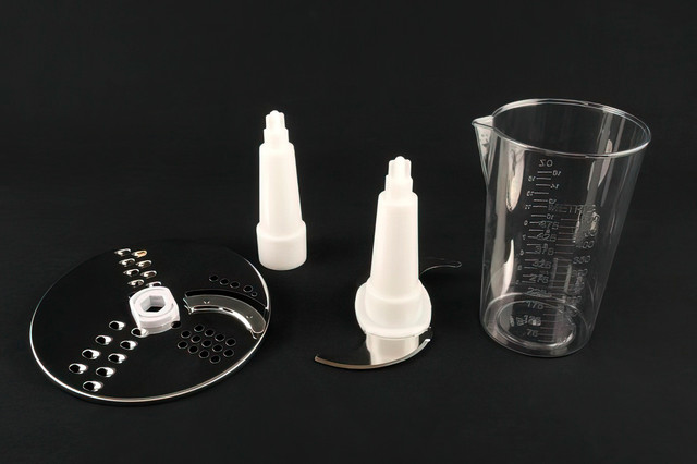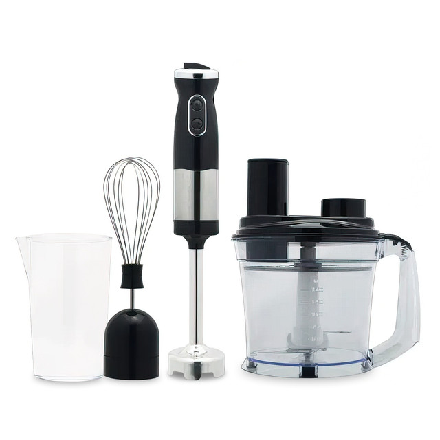 Занурювальний блендер - Papa John 2029 - це невеликий кухонний прилад, який простий у використанні, безпечний і надійний. Пристрій застосовується для збивання, подрібнення та змішування. Девайс має потужність 750 Вт, гострі ножі з нержавіючої сталі, завдяки чому добре перемелює ягоди, горіхи, фрукти або фарш. Девайс має плавне регулювання швидкості та турбо режим. Велика чаша об'ємом в 1.7 л, оснащена диском для терки та шатківниці, відмінно впорається з фаршем, паштетом або тестом для млинців. Мала чаша на 0.6 л добре підійде для коктейлів або смузі.