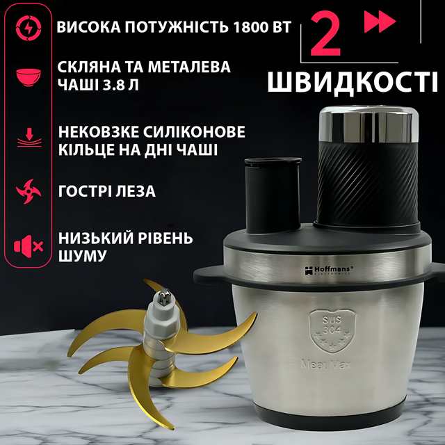 Кухонний блендер 10 в 1 Hoffmans HM-8849, 1800 Вт, 2 чаші по 3.8 л (скло + неірж. сталь), подрібнювач, шатківниця, пюре, фарш, 2 швидкості
