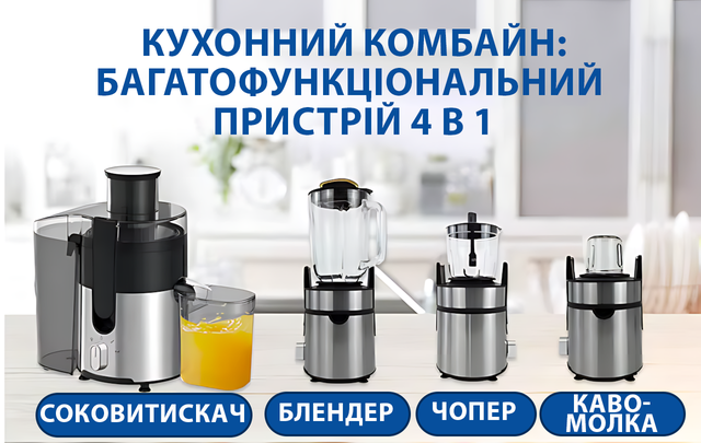 - Функції: соковичавниця, блендер, кавомолка, подрібнювач;