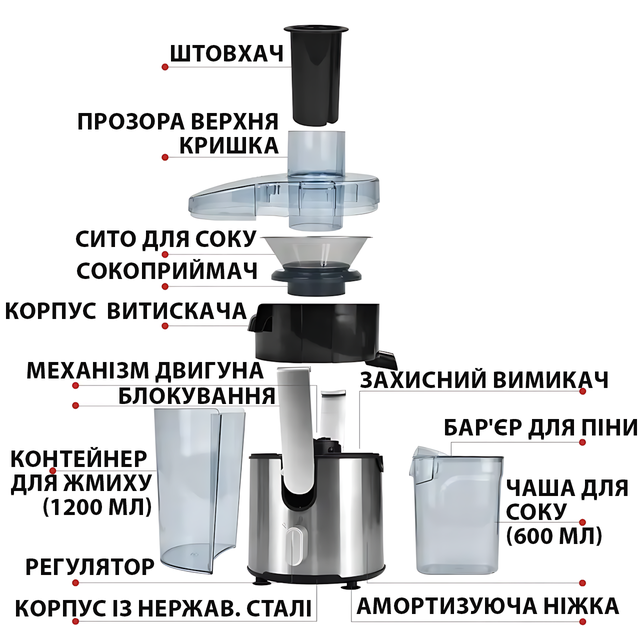 - ✔ Система "крапля-стоп" — краплі соку більше не зіпсують ваш кухонний інтер'єр! Все чисто й акуратно.