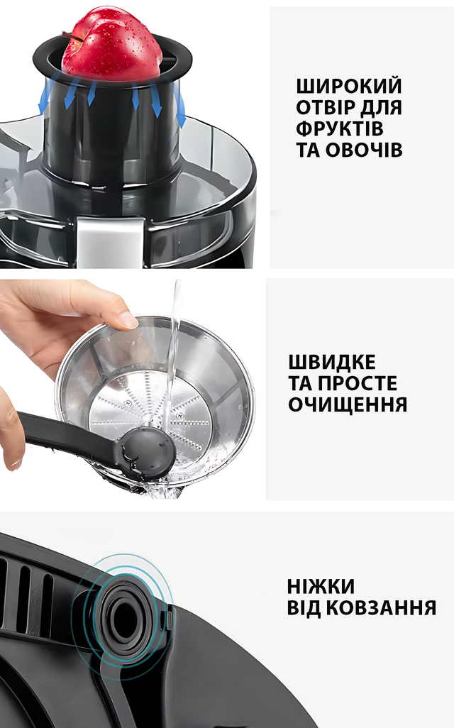 - ✔ Широка горловина — навіть найбільші яблука й апельсини без зусиль проходять через неї. Максимум комфорту, мінімум зусиль!