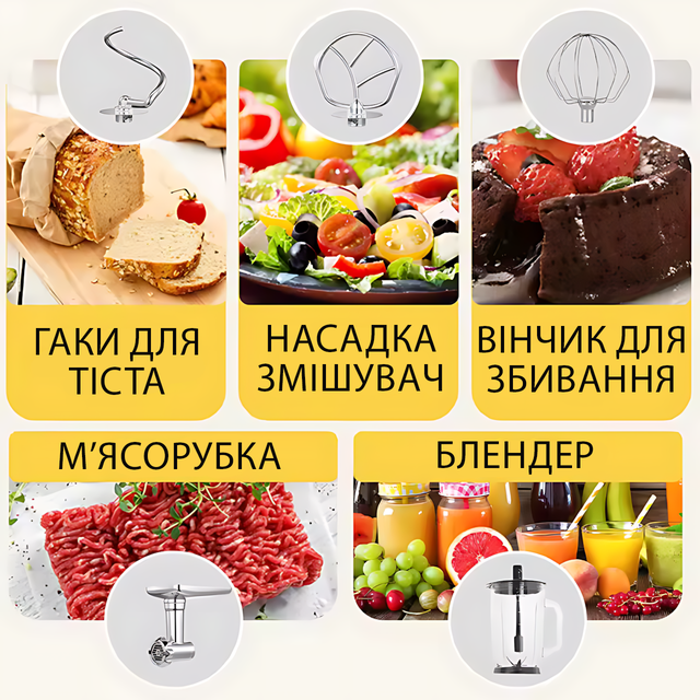 - Тип прибора: Кухонний комбайн 3-в-1 (м'ясорубка + блендер + міксер);