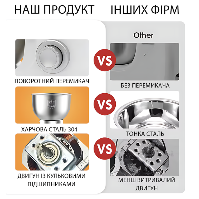 З потужністю 1600 Вт, місткою металевою чашею на 8 літрів і цілим арсеналом функцій, цей красень впорається з тістом на пиріжки, перемеле м'ясо для котлет або змішує крем для торта без надмірного шуму та зусиль.