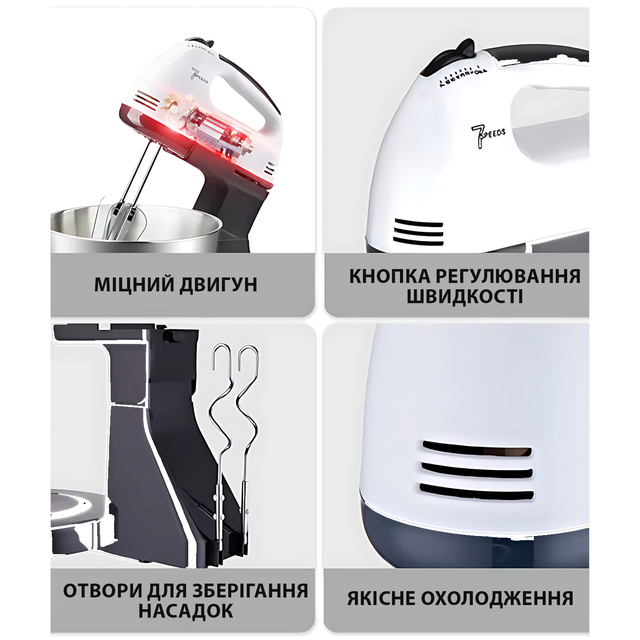 - ???? 7 швидкостей. Від легкого перемішування до інтенсивного збивання. Підберіть ідеальний режим для будь-якого рецепта.