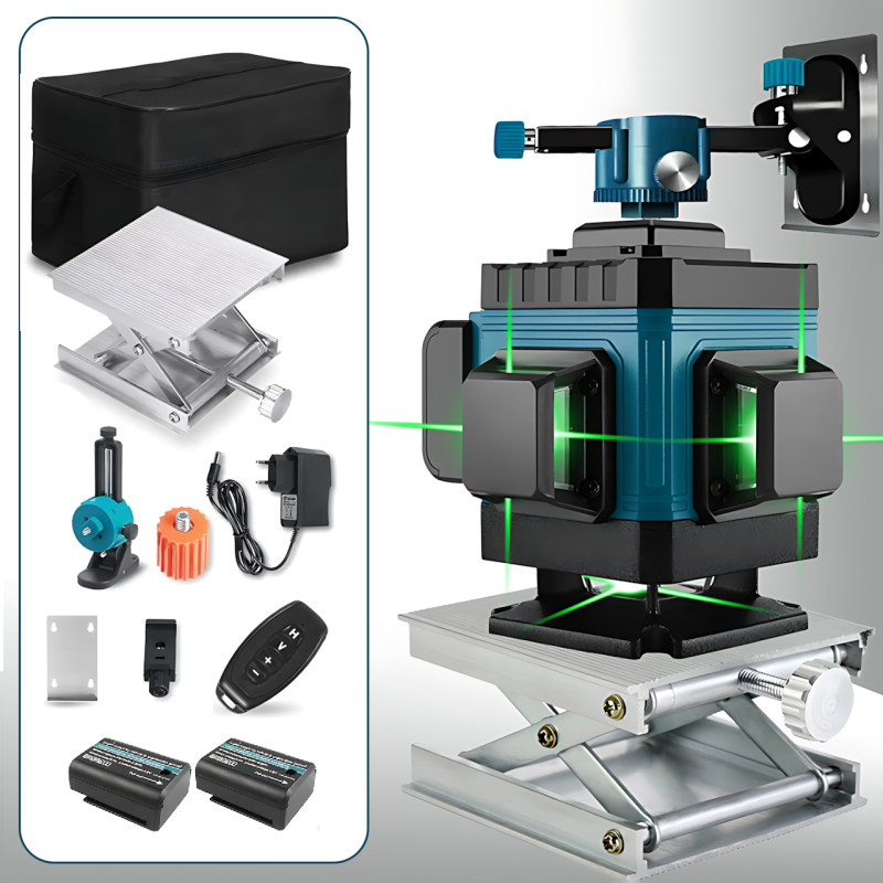 Лазерний 4D рівень будівельний, 16 ліній, зелений промінь, з пультом, у тканинному чохлі з 2 акумуляторами