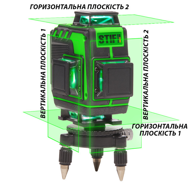 - Чотири площини з 16 лініями: Лазерний рівень 4D має чотири діоди, які утворюють чотири площини — дві горизонтальні та дві вертикальні. Це дає змогу використовувати його для різних завдань, як-от монтаж стель і стяжка підлоги;
