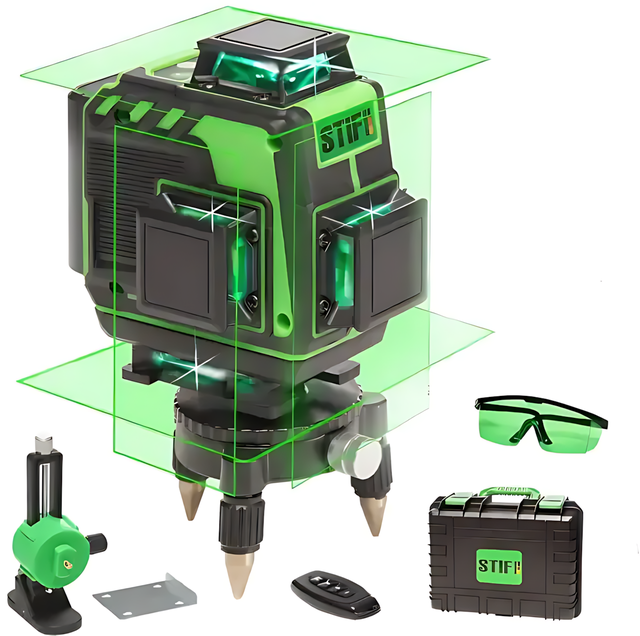 Лазерний 4D рівень, нівелір із дисплеєм заряду та пультом у кейсі, 16 зелених променів