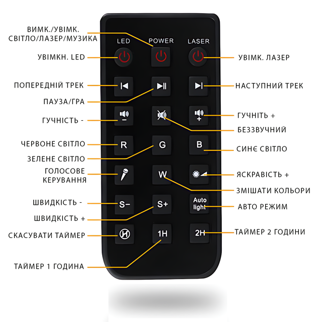 - Режими роботи: авто, стрибки, градієнт, пульсація, алюмінієвий ефект, лазерний візерунок;