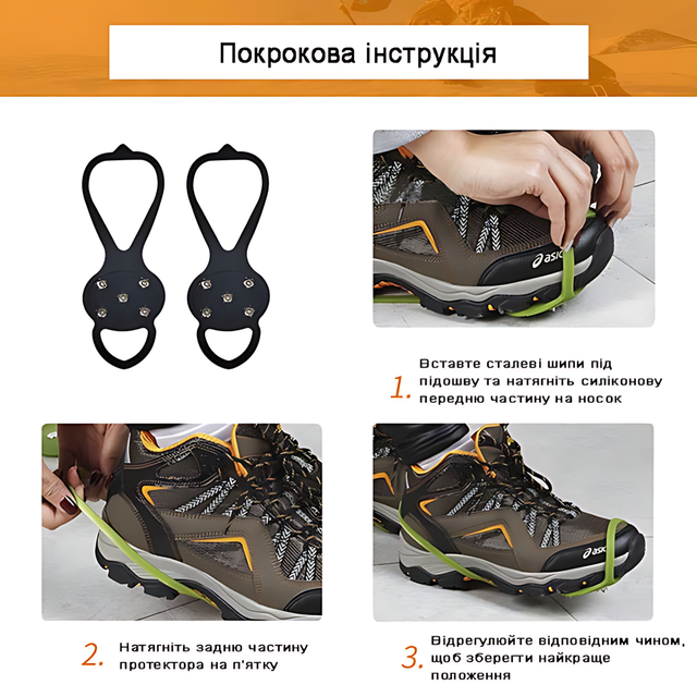 Антиковзні накладки надягають прямо на взуття й миттєво покращують зчеплення з льодом, вкатаним снігом і підступними блискучими стежками біля під'їзду.