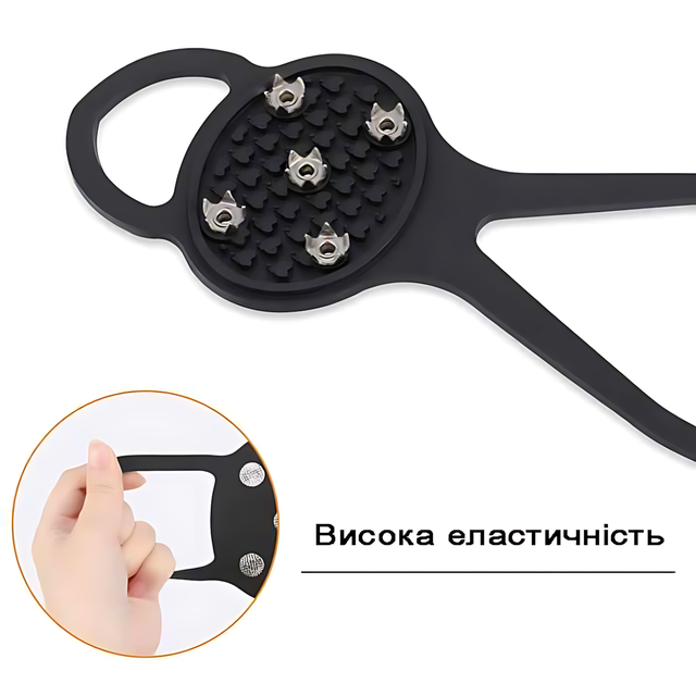 Кожна накладка обладнана 5 гострими сталевими шипами (у сумі 10 на парі), які буквально вгризаються в лід і тримають вас на ногах, а не в кучугурі. Основа з гнучкої та міцної гуми легко тягнеться й підходить практично під будь-яке взуття — черевики, кросівки, чоботи, навіть «ті найзручніші».