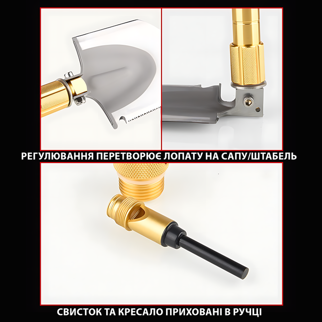 - ✅ Широкий функціонал — крім лопати в комплекті сокира, рятувальний молоток, тактичний ніж і навіть свисток!