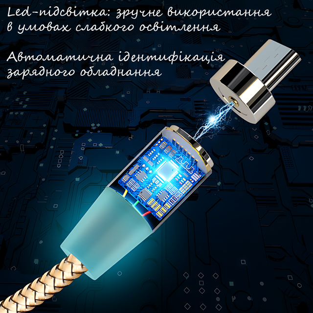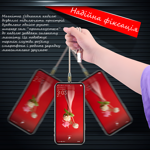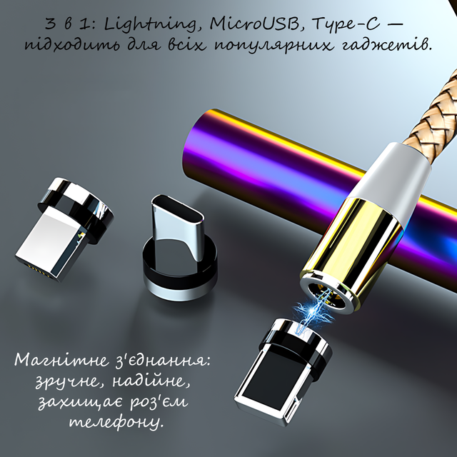 Lightning, MicroUSB і Type-C — все під рукою. Просто встановіть магнітний штекер один раз, і ваш роз'єм завжди буде в безпеці. Кабель миттєво з'єднується з конектором завдяки потужним магнітам, а обертання на 360° робить під'єднання легким і швидким, навіть виліпивши.