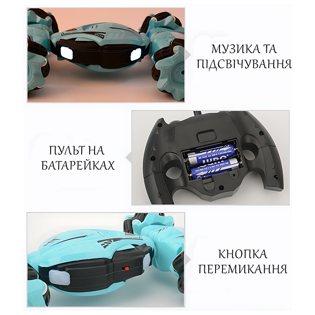 - Рух у будь-якому положенні: Машинка може їздити боком і перевертатися, зберігаючи свою швидкість і маневровість;