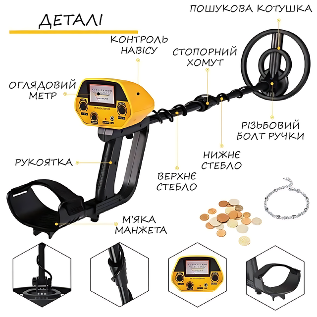За допомогою металошукача ви можете полювати за монетами, реліквіями, дорогоцінностями, золотом і сріблом де завгодно. Цей металошукач універсальний і простий у використанні. Особливості містять два режими роботи: суцільнометалевий, диск. ВСІ МЕТАЛ — це дає змогу шукати всі різні типи металу з балансом ґрунту та високою чутливістю. Це найкращий режим роботи. ДИСК - розпізнає, який метал виявляється. Гучність — для регулювання рівня гучності динаміка та навушників. Роз'єм для навушників — дає змогу під'єднати до детектора навушники (не входять до комплекту). View Метр і покажчик - Стрілка лічильника повертається вправо, якщо метал виявлений. Водонепроникна пошукова котушка — дає змогу використовувати металошукач, навіть якщо вам необхідно встановити його під водою. ПРИМІТКА: Пошукова котушка водонепроникна, а корпус керування — ні. Працює від двох лужних батарейок 9 В (не входять до комплекту).