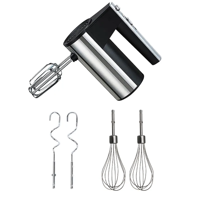 - Зручні насадки: До комплекту входять два типи насадок — віночки для повітряного збивання та гаки для замішування тіста. Це дає змогу легко змінювати насадки в процесі роботи, забезпечуючи гнучкість і зручність.