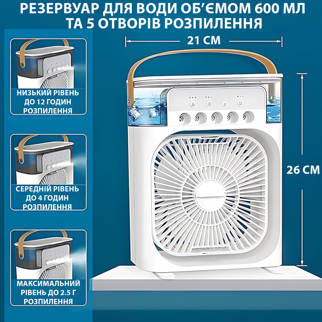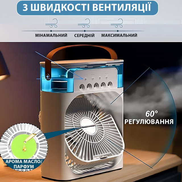 - ???? Охолодження + зволоження — три швидкості вентилятора та три рівні зволоження. У цьому чудо-пристрою кожен знайде свій ідеальний режим!