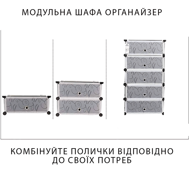 Ця сучасна модульна шафа стане ідеальним вибором для організації простору у вашому домі, офісі або гуртожитку. Полиця-конструктор поєднує в собі зручність, стиль і практичність, даючи змогу акуратно зберігати взуття, одяг, книги та навіть аксесуари.