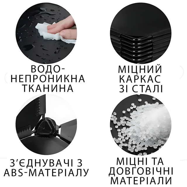 - Матеріал: АВС-пластик (пластикова плівка) та сталевий каркас;