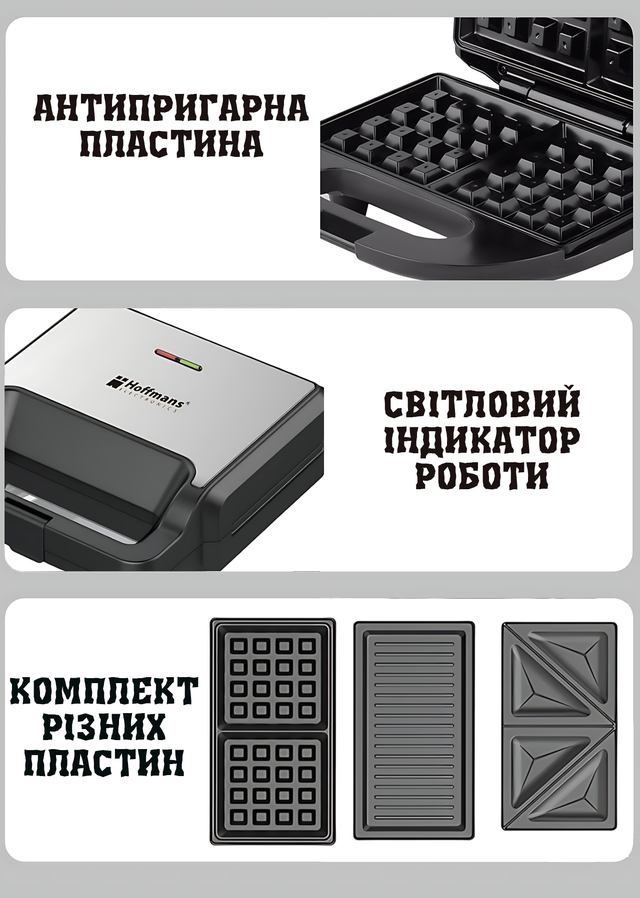 Мультимейкер 3 в 1 Hoffmans HM-3019 — електровафельниця, гриль і сендвічниця, 1000 Вт, змінні панелі