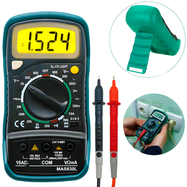 - Універсальність: Мультиметр MZ MAS830L 7945 об'єднує функції амперметра, вольтметра та омметра в одному пристрої, забезпечуючи широкий спектр вимірювань електричних параметрів.